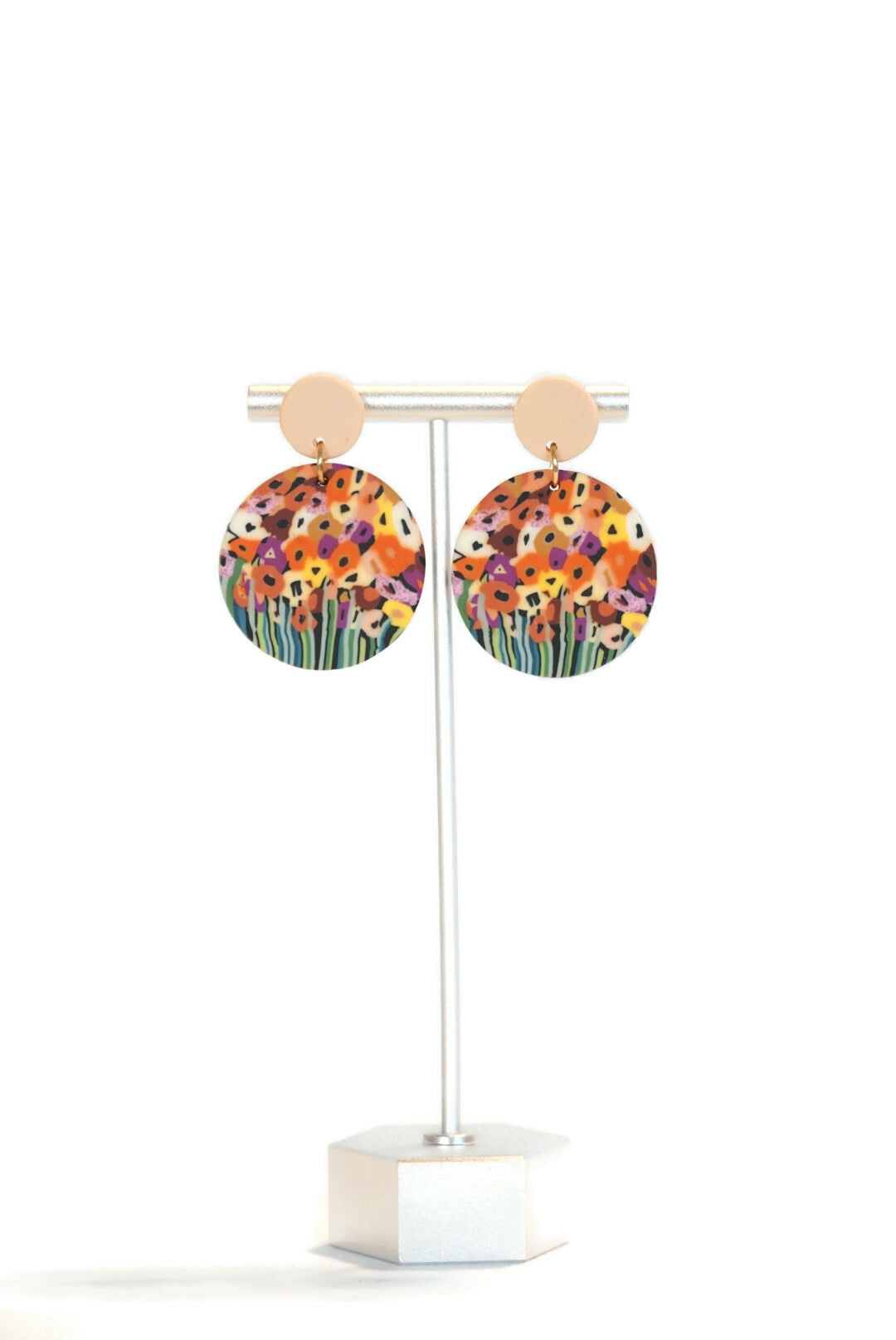 Introducing our Floral Harmony Clay Earrings – a delicate fusion of artistry and elegance. Circle studs and larger dangly circles crafted from clay showcase an abstract flower garden in muted hues. Elevate your style with nature's beauty and a touch of subtle sophistication.