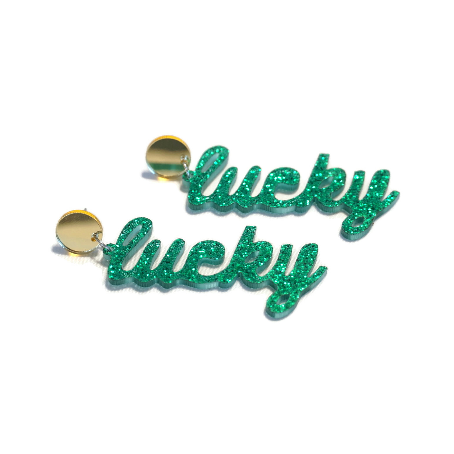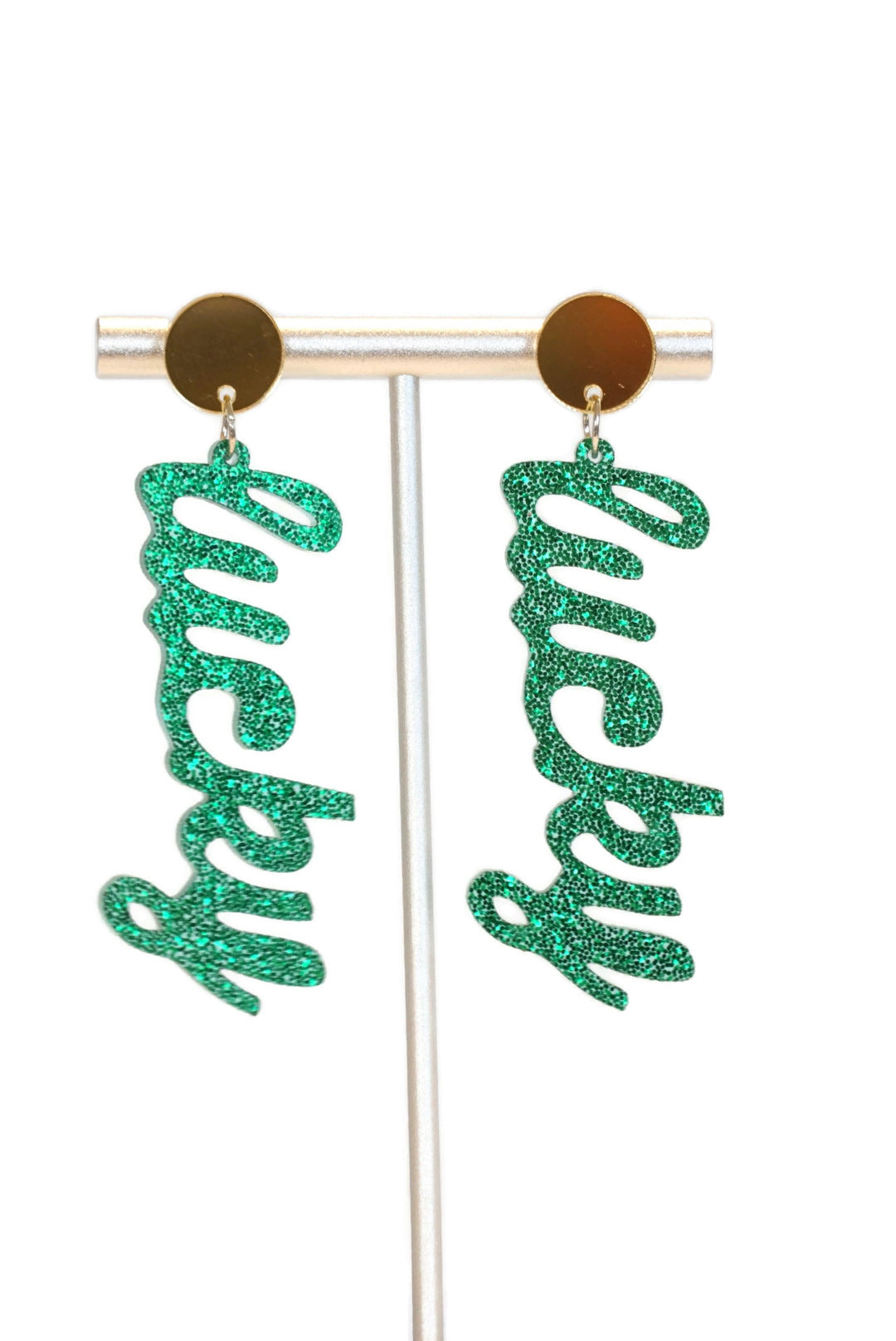 "Unleash your inner leprechaun with our dazzling St. Patrick's Day earrings! Featuring luxe gold studs and long, dangly green charms spelling 'Lucky' in sparkly acrylic. Elevate your style, sparkle with luck, and let the festivities begin!"