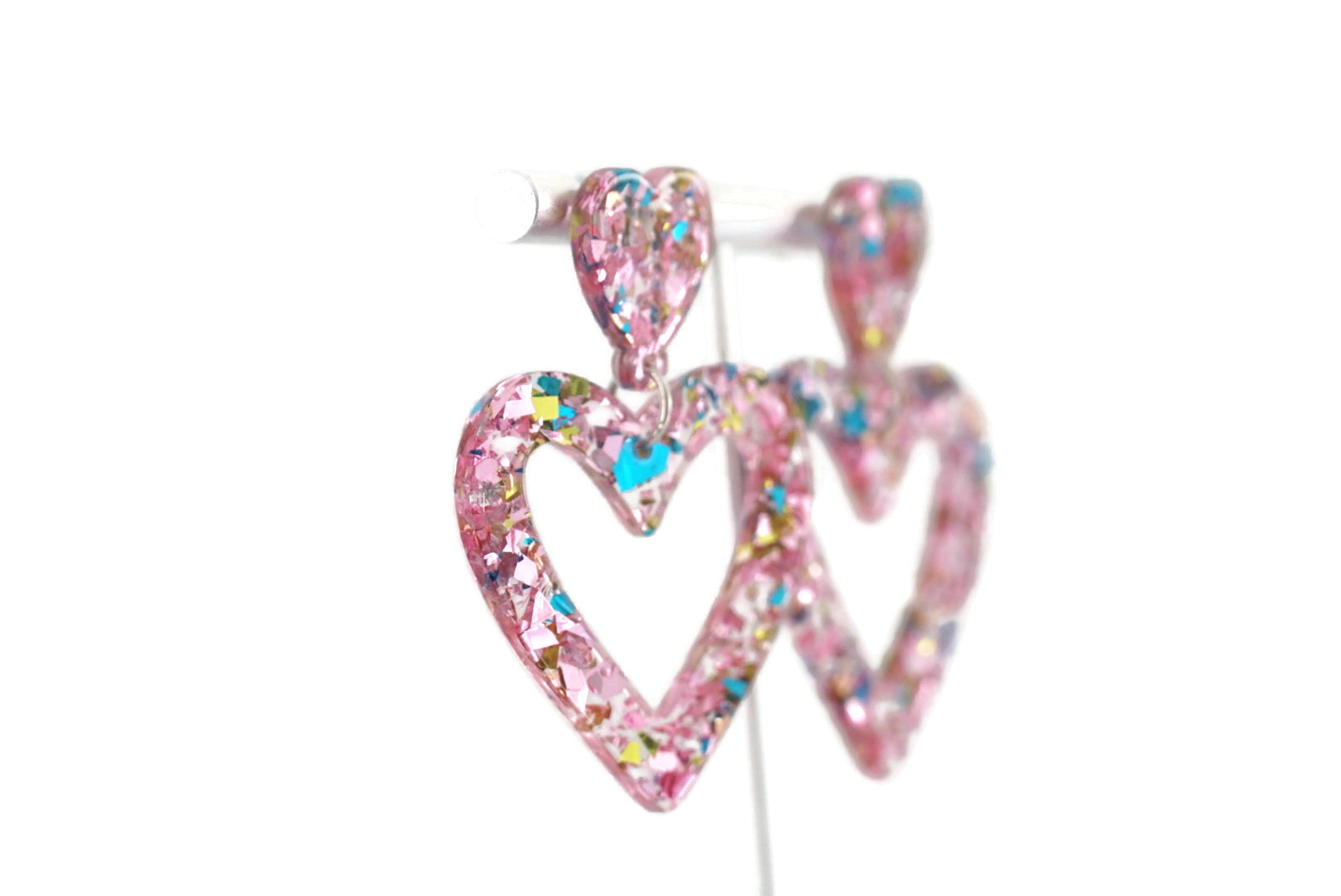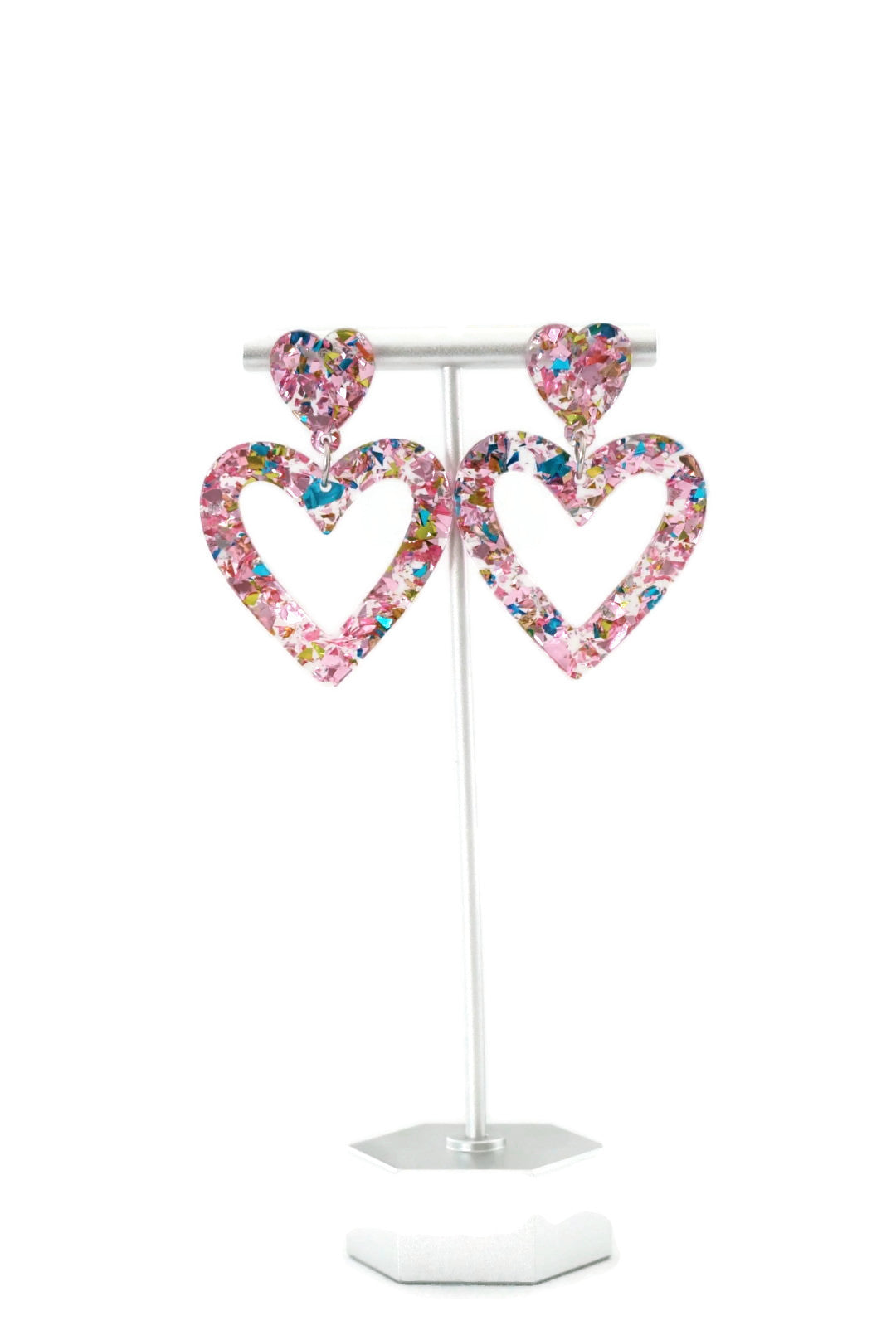 These earrings showcase a charming design with a stud heart paired with a larger, dangling heart, both filled with a delightful mix of pink and blue confetti, captured within a high-quality resin.