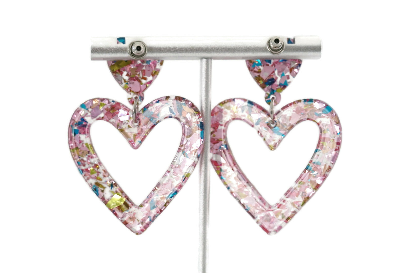 The stud heart lays the foundation for sweetness, while the dangling heart adds a touch of movement and festivity. The combination of pink and blue confetti creates a dynamic and cheerful display, reminiscent of confetti-filled moments of joy.